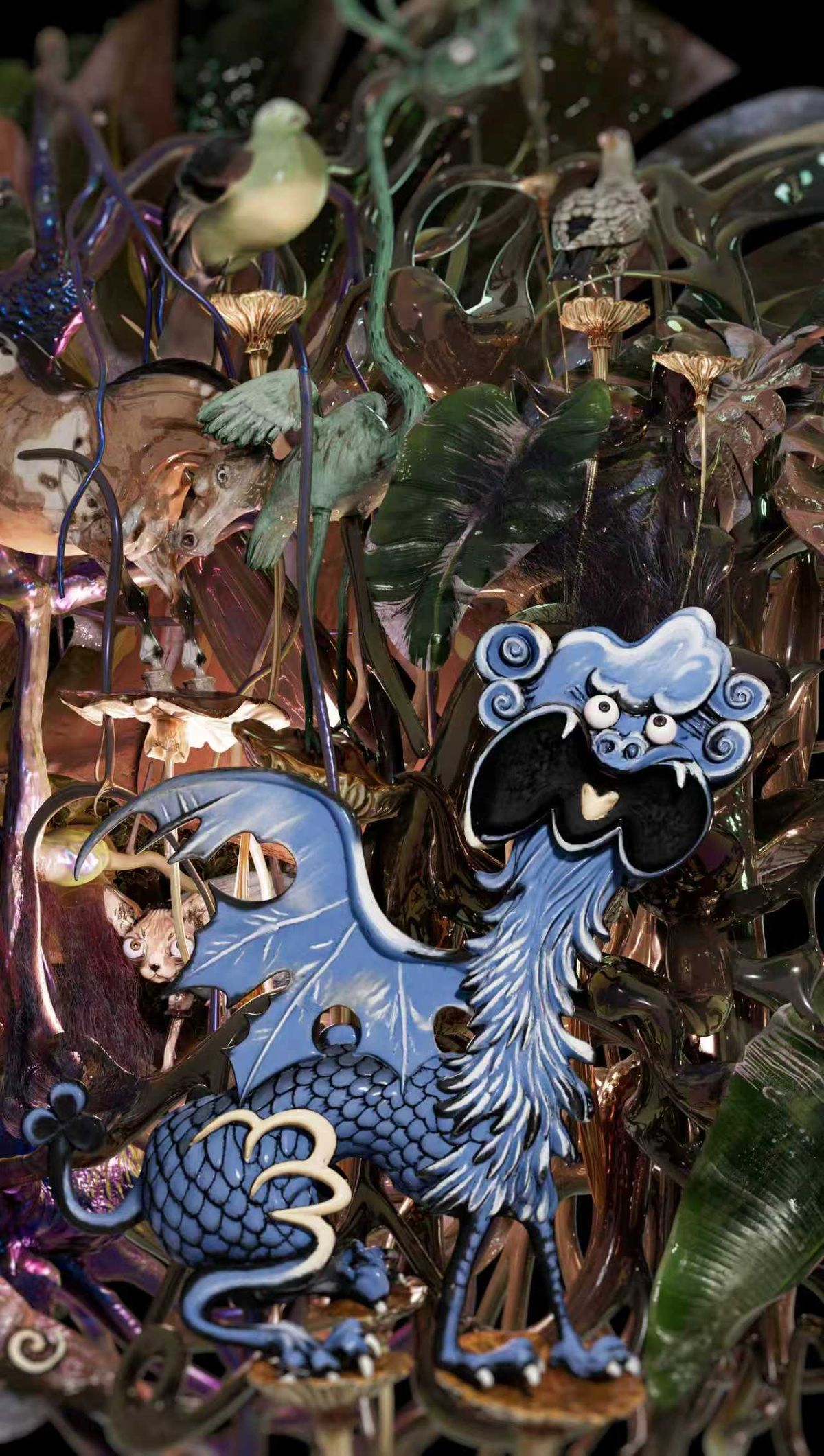 Mythical leaf verdure tapestry with animals and birds—ver2026” by artist Frank WANG Yefeng, depicts an imaginary forest brimming with vitality and infinite possibilities. The beings in the imagery mostly originate from traditional Chinese culture and folklore, while artist weaves in visual cues from diverse cultural systems. The creation processes combined 3D animation, AI technology, and easel painting. The final work comprises five 15-second 3D animation segments, displayed across the five outdoor public screens spanning West Nanjing Road.